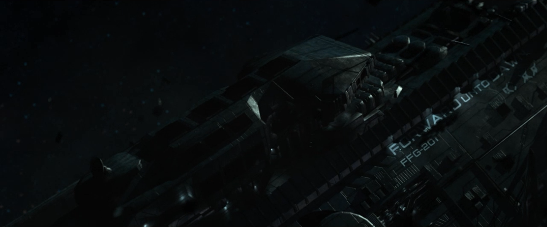 The episode starts out with this shot of the severely damaged Forward Unto Dawn ship. You can see it’s designation as FFG-201.