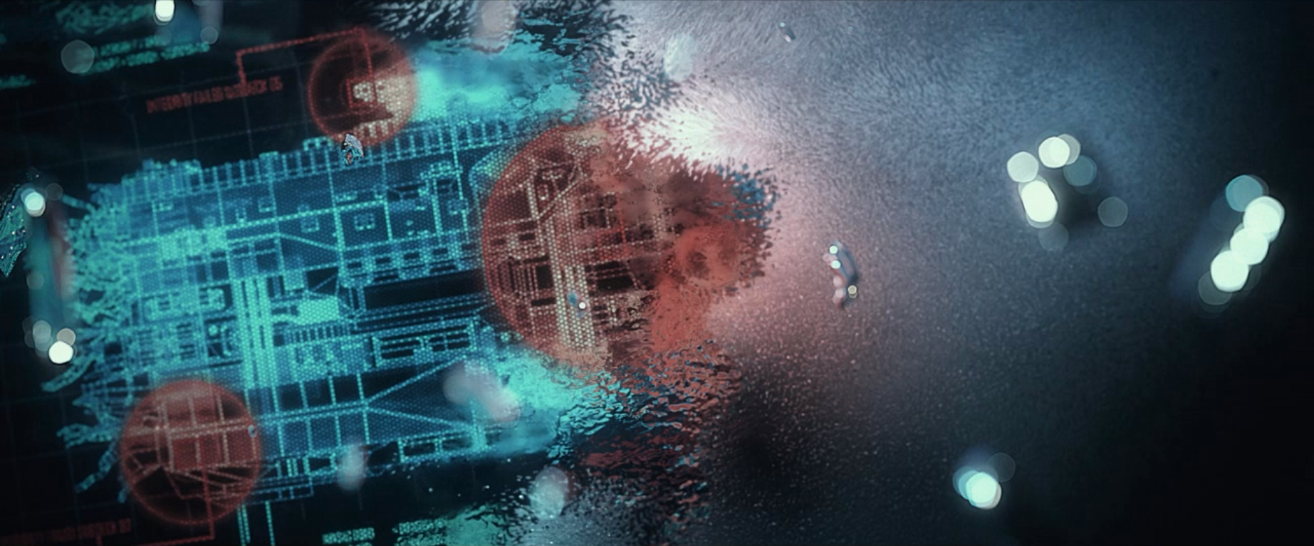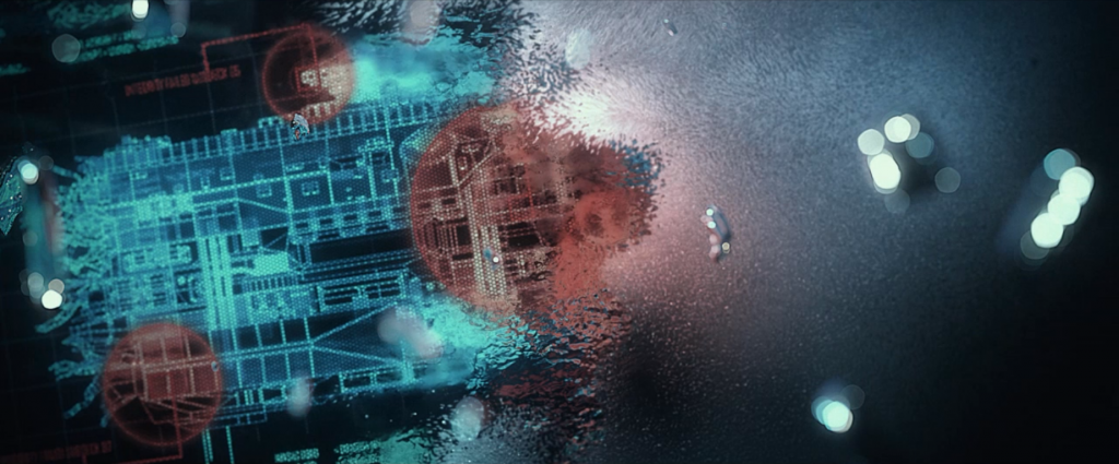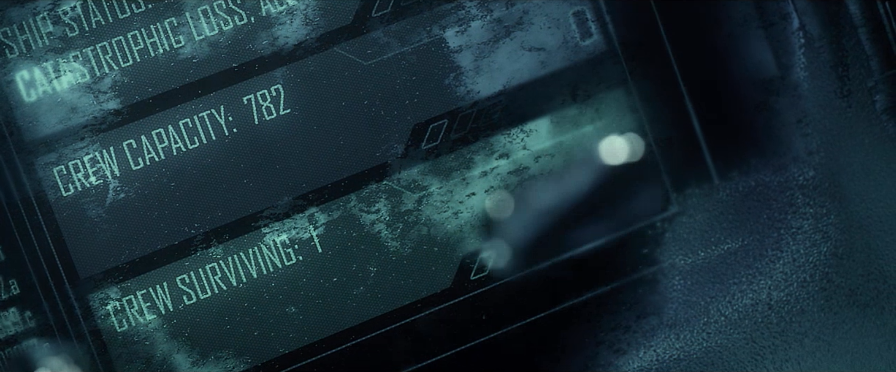 A display screen, but who is looking at it and from where? Take note of these graphics. A fantastic job of looking futuristic yet recognizable.