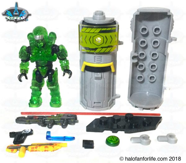 The Spartan itself also has the color theme. Here it has mostly translucent green armor to match the Overshield effect in game. It’s a good look. You long time readers know I LOVE translucent figures.