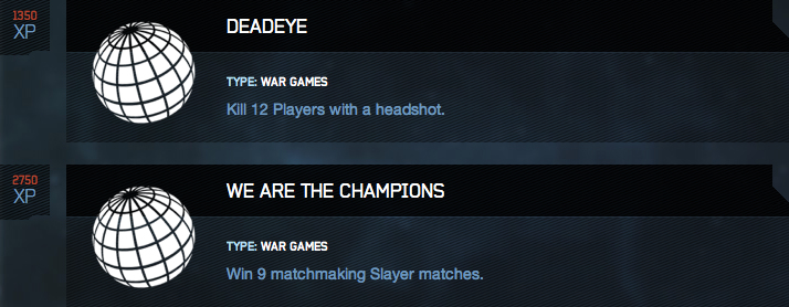 Halo 4 War Games daily challenges: 12-20-12 Posted on 12/21/2012 by Sal Both are fairly easy. First one no problem. Second you can get in a mix of Slayer/Swat to accomplish this.