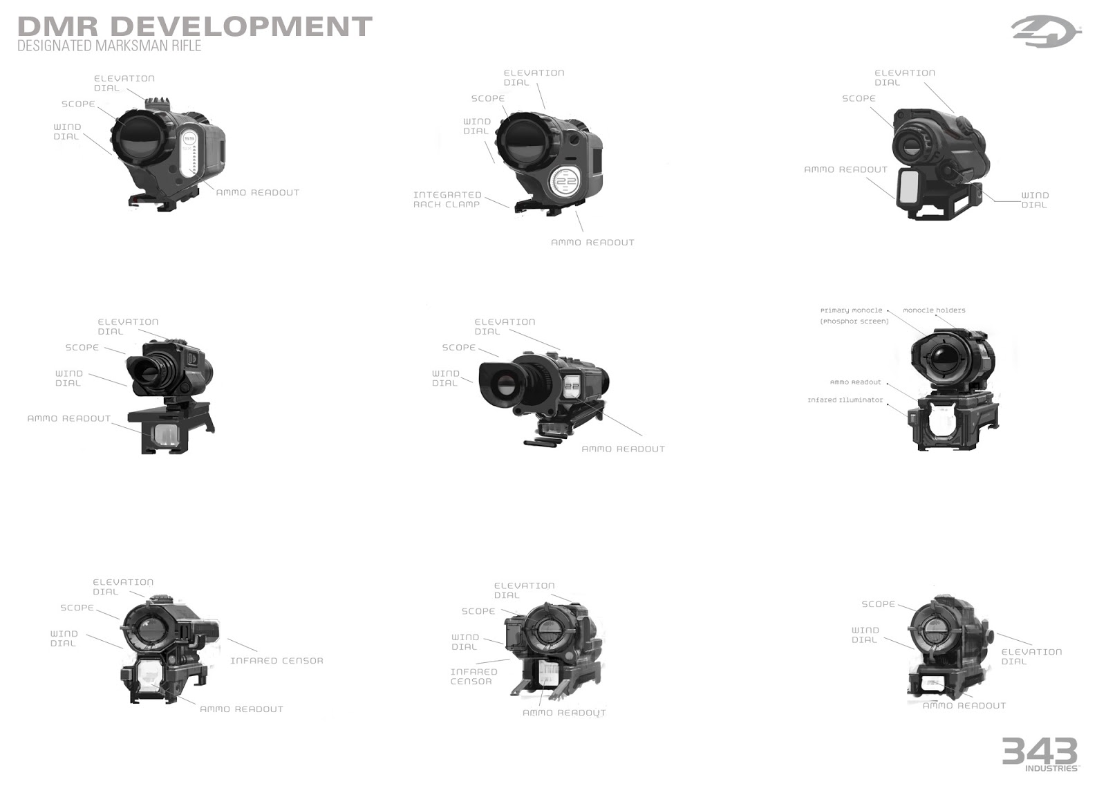 You can see great care was taken into account for the redesign of the DMR for Halo 4, with several overall and specific scope designs presented here.
