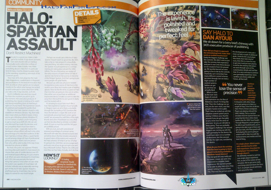 On the left of this two-page spread is info on Spartan Assault. The writer talks about “how much like a true Halo experience Spartan Assault actually is.” They also lament the decision for it to only be available on Win8 Devices (I agree).